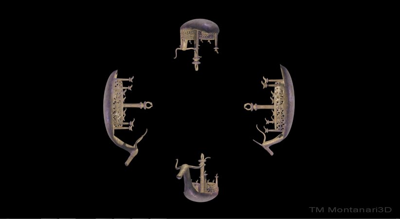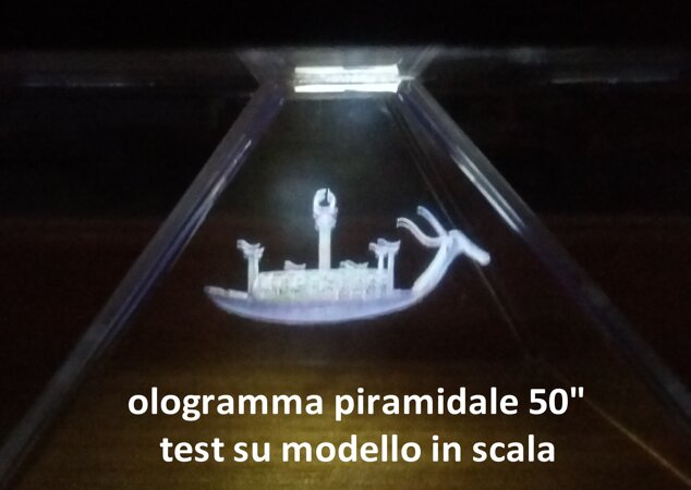 La tecnologia piramidale consente di vedere l'oggetto da tutti e quattro i lati, ad esempio, la navetta nuragica qui esposta mostrerà il suo fianco se vista dai lati, la prua se osservata da davanti e la poppa se osservata da dietro, stesso discorso per il Gigante di Monte Prama.