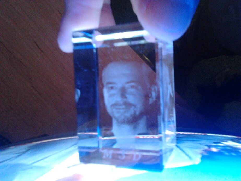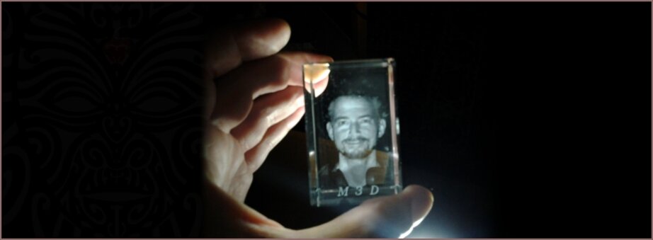 L'ologramma in vetro sintetico si ottiene grazie ad una stampante laser che incide tridimensionalmente punto dopo punto un supporto volumetrico trasparente. Il soggetto è infatti rappresentato da una "nuvola di punti", ogni lato rappresenta il giusto profilo e in rotazione i lati si raccordano quasi perfettamente, l'importante è illuminarlo a dovere così da valorizzare i punti incisi.